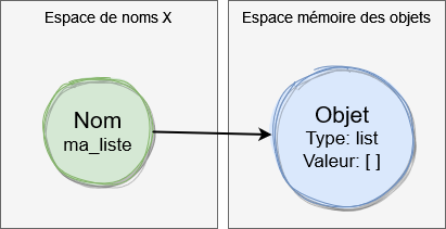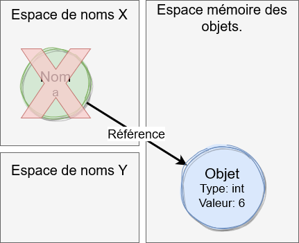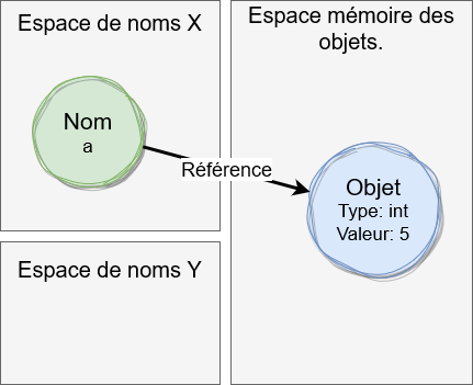 Une "variable" en Python est appelée un "nom" ("name" en anglais), mais on peut aussi utiliser le terme "identifiant", les trois (variable, nom et identifiant) sont des synonymes. Un identifiant ne contient pas de valeur, ne contient pas d'objet, mais pointe vers un objet, on dit aussi qu'un identifiant fait référence à un objet, ou rérérence un objet.