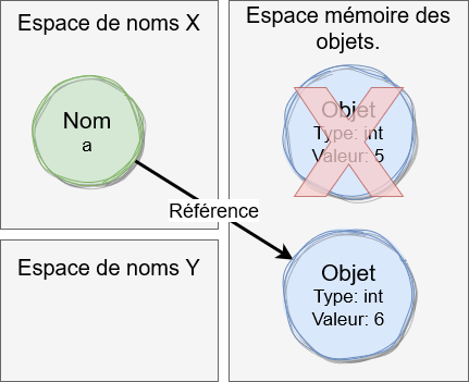 6 - a est modifié pour pointer vers l'objet à droite du =. De plus, le mécanisme de garbage collector qu'on verra plus