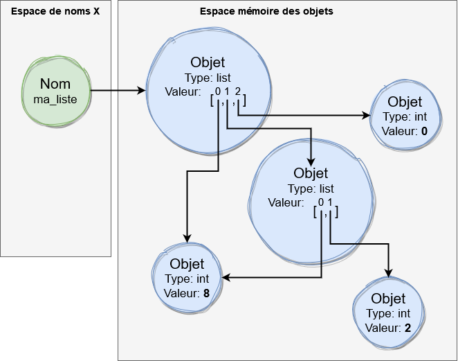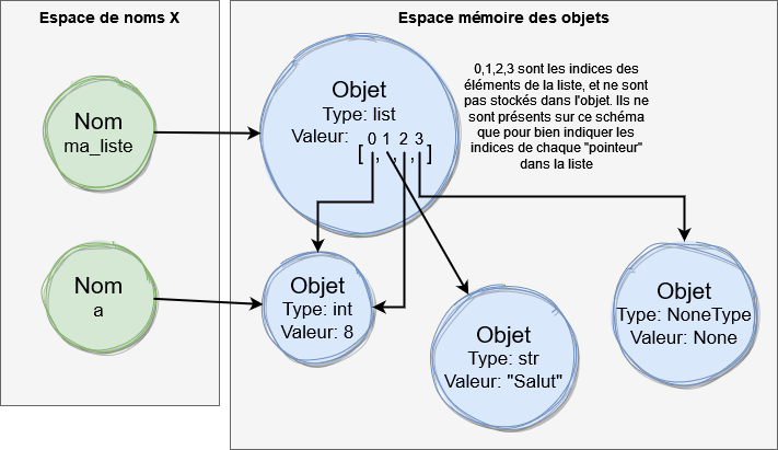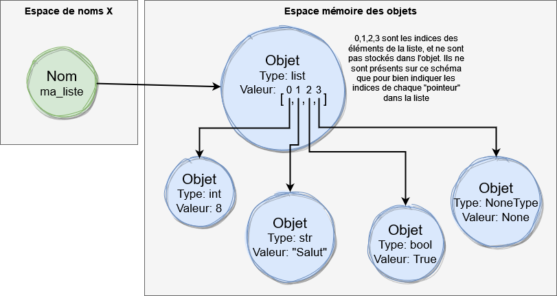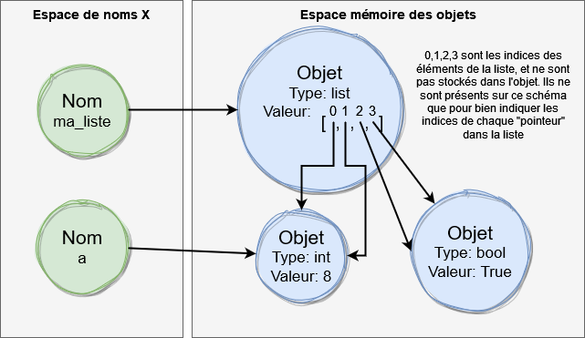 Les listes et les tuples sont des types qui contiennent plusieurs valeurs. Ces valeurs ne sont pas DANS les objets liste ou tuples, mais sont des objets distincts, référencés par la liste ou le tuple en question. Les listes et tuples sont en quelque sorte des suites de pointeurs. Voyons quelques exemples de listes, et leur représentation en mémoire.