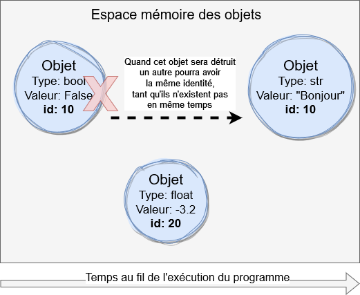 Plusieurs objets peuvent avoir la même identité, mais ils ne doivent pas exister en même temps. Par exemple si pendant l'exécution d'un programme un objet a l'identité 10, aucun autre objet ne peut avoir l'identité 10 tant qu'il existe. Quand cet objet est détruit, alors à ce moment l'identité 10 peu à nouveau être utilisé par un nouvel objet, qui sera probablement d'un type différent et avec une valeur différente du précédent objet qui avait la même identité.