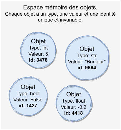 Tout objet en Python a une identité représentée par un nombre entier qui doit être unique au sein d'un programme en cours d'exécution. L'identité d'un objet est définitive et ne peux être changée au cours de l'existence de l'objet. Ainsi, notre représentation des données d'un programme en Python devient: