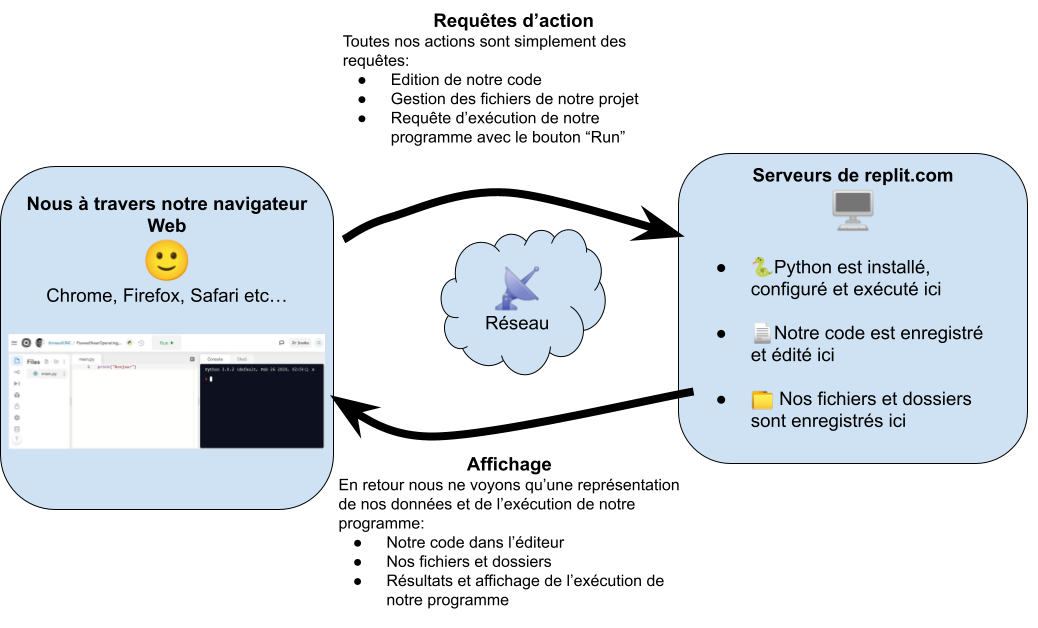 Vous pouvez aussi développer en Python grâce au service en ligne replit.com. Dans cette configuration, replit nous sert à tout: éditeur de code, gestion de projet, et exécution du code.