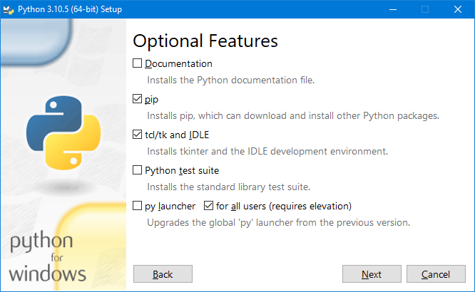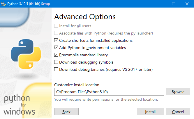 Il faut télécharger l'installeur officiel. Pour chaque version de Python il y a plusieurs sous-versions que vous pouvez télécharger par exemple 32 ou 64 bit, ARM, ou encore "embeddable package". Ce qu'il vous faut est la version "Windows installer (64 bit)", et c'est la version par défaut que la page d'accueil du site propose. Puis vous suivez les étapes de l'installation mais choisissez une installation personnalisée afin d'être sûr d'avoir au minimum les options suivantes: