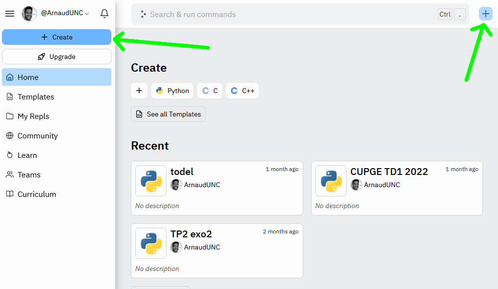 2) ↓ Une fois identifié avec votre compte, créer ce qu'ils appellent un repl, c'est-à-dire un projet de code, en utilisant les boutons suivants: