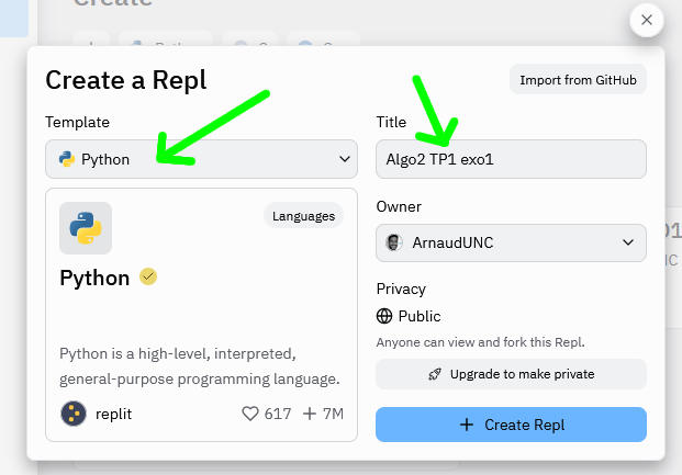 3) ↓ Choisir le langage que vous voulez utiliser donc Python, et donner un nom descriptif qui vous permettra de facilement retrouver votre projet plus tard: