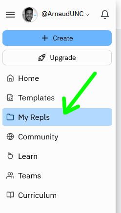 4) ↓ Vous retrouverez votre repl (votre projet) parmi la liste de tous vos repl, accessible ici. Vous pourrez les organiser en dossiers, les renommer et les supprimer: