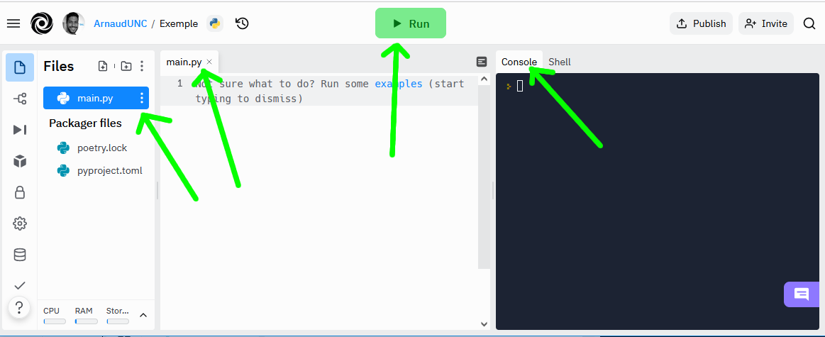 5) ↓ Une fois votre repl ouvert, vous verrez trois zones: .
