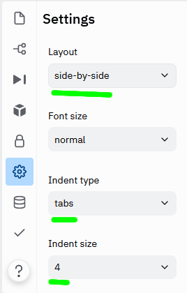 7) ↓ Dans les options vous pouvez changer l'agencement visuel des différentes zones (side-by-side c'est-à-dire côte-à-côte ou stacked empilées). Vous pouvez aussi choisir si vous voulez des caractères espaces ou tabulations pour l'indentation de votre code (Python recommande des espaces, personnellement je préfère les tabulations). Et enfin vous pouvez changer la taille visuelle des indentations (nombre de caractères espace ou taille des tabulations), mais 4 est une bonne valeur par défaut.