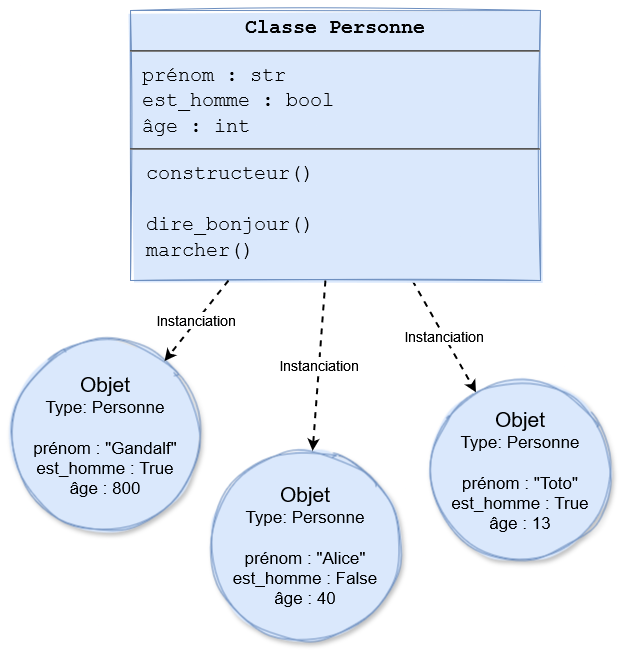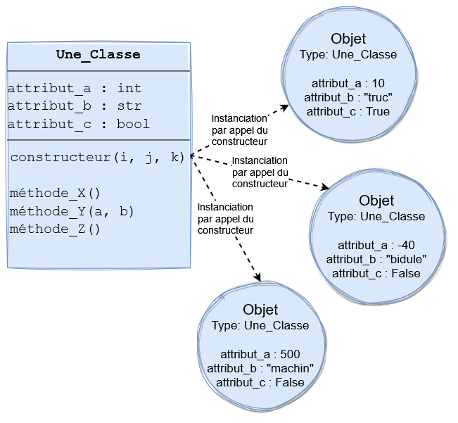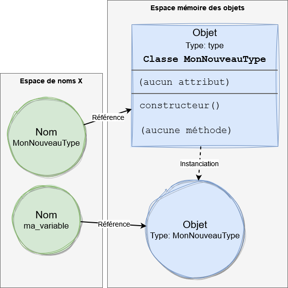 Remarquez que la classe en elle-même est un objet de type "type", qu'elle est référencée par une variable qui a le même nom qu'elle, et que l'objet instancié est référencé par une variable également.