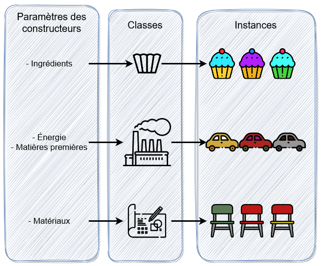 En POO on utilise le terme "classe" pour désigner un type. Une classe est comme un modèle, un moule, qui contient le plan de chaque objet de ce type doit avoir. À partir de ce modèle, qui devient alors un type à part entière, on peut ensuite créer des objets de ce type, qu'on appelle alors "instances". On appelle "instanciation" ce processus de création d'objets à partir d'une classe, et c'est le "constructeur" de la classe qui permet l'instanciation.